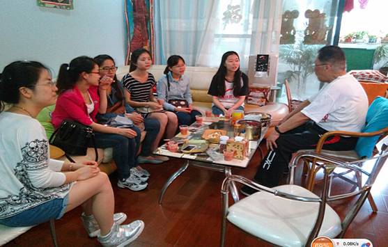 杨教授平易近人,和蔼可亲,一口流利的口语也着实震惊了我们。一进门,我们看到杨教授穿着Mickey T-shirt,黑色运动裤,顿时感觉到一股青春的气息与活力。接着杨教授招呼我们坐下,师母则忙活着给我们倒果汁、洗水果。杨教授对我们的到来感到格外高兴,热情的与我们交谈,在他的带领下,我们的交流几乎全程是用英语,他让我们用英语介绍自己,我们也用英语询问他的经历、爱好等。他曾在文工团工作过,所以对艺术方面有特别的爱好,他给我们介绍他的画,他的小提琴、钢琴,他的书法作品,我们听得津津乐道,我们欣赏他的作品,惊讶于他的多才多艺,佩服他的专业水平以及他身上所散发出来的活力与青春气息。在我们的要求下,他还给我们唱了英文歌“when I was young”,优美的嗓音,一点都不亚于歌唱家。他还主动带我们参观了他们的房间,我们发现几乎每间房间的墙上都挂满了杨老师的画,特别是书房,不仅墙上挂满了画,门后还放了许多杨老师的作品,还有许多乐器,整个一艺术家的创作空间。