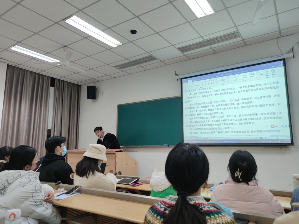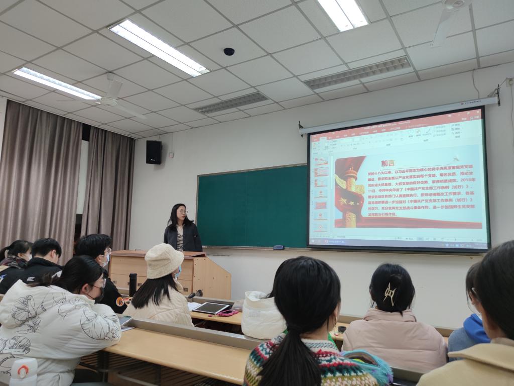 接下来,费君同志带领大家学习了2018年11月中共中央印发的《中国共产党支部工作条例(试行)》。该同志介绍道,党的十八大以来,以习近平同志为核心的党中央的高度重视定党支部建设,要求把全面从严治党落实到每个支部、每名党员,推动全党形成大抓基层、大抓支部的良好态势,取得明显成效。自印发后,中共中央要求各地区部门认真遵照执行,按照巡视整改工作要求,各基层党组织要进一步加强对《中国共产党支部工作条例(试行)》的学习,充分发挥党支部战斗堡垒作用,进一步加强师生党支部发挥政治引领作用。