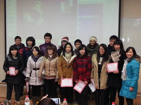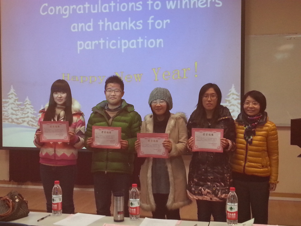 1月6日,伟德国际1946bv官网于科技楼举办了2012级新生英语语音比赛。伟德国际1946bv官网副经理张再红老师、翻译系主任李菁老师、英语系副主任夏桃珍老师、系副主任彭艳老师、惠海峰老师和外教外教Braden等到现场为比赛担任评委。本次有翻译、英语、国际商务四个班共三十九位同学分小组参与比赛,最终来自英语班的刘灵艺、朱啸、张睿妍、吴慧、祝上林同学凭借精彩的小组表演夺得冠军。