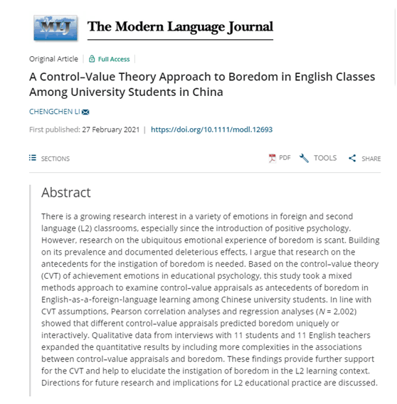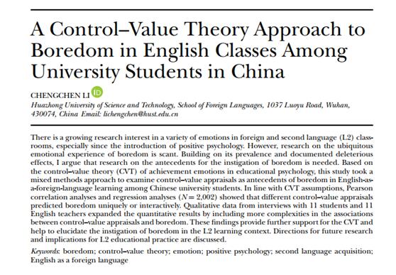 2月27日,伟德国际1946bv官网李成陈博士以独立作者身份在Modern Language Journal发表题为“A Control–Value Theory Approach to Boredom in English Classes Among University Students in China” (控制-价值理论视角下我国大学英语课堂无聊情绪研究)的实证型论文。
