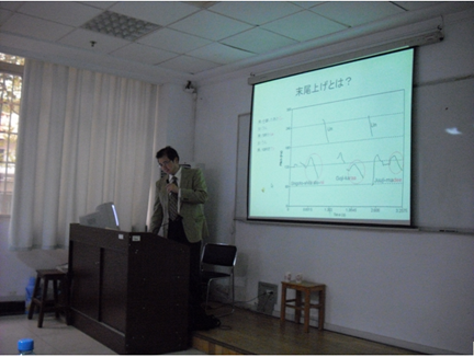 2009年10月21日星期三下午,日本神户大学定延利之教授在科技楼南楼109室给伟德国际1946bv官网日本文化研究所的师生们做了一次十分精彩的演讲。讲座从下午三点开始,快六点结束。内容主要是阐述为什么日本人说话时句子末尾会提高声调,同时教授还为我们讲解了合成词发音的基本技巧和规律,令在座的同学老师们都受益匪浅。