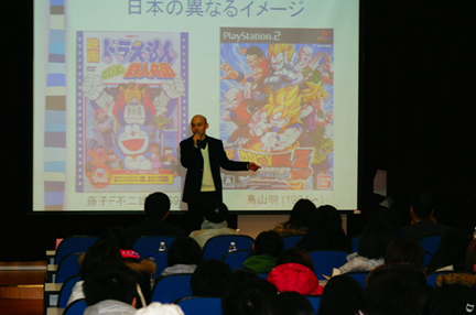最后,菅沼胜彦老师做了题为《日本流行文化与全球化》的演讲。菅沼老师主要就日本的流行文化与全球化之间的联系做了此次演讲。日本的流行文化在世界范围内扩散程度也很大,在亚洲、欧洲、美洲、大洋洲都可以见到日本流行文化的影子。但是,异国文化的普及也带来了文化交流与文化障碍的问题。在面对异国文化时候,我们其实已经无意识地做出了选择性接受,我们只接受了我们愿意接受的部分,对我们不愿意接受的部分视而不见。如果在今后的异文化交流中我们能够清楚的意识到这一点,对于国际交流未尝不是一个福音。