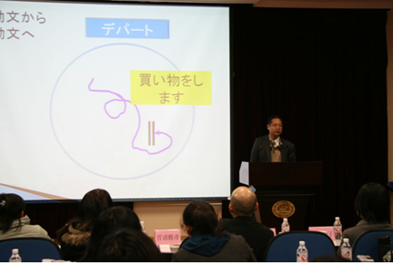 第二场演讲由南里敬三副教授主讲,题为《语法与会话》。南里教授研究的是语法学,这场演讲主要是围绕日语日常会话中的助词展开的。南里教授的演讲十分生动风趣,他举的一个关于助词用法的例子让我印象十分深刻。