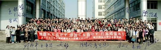 陈俊森教授代表会议主办方在开幕式上致辞。陈教授从中国的日语教育现状和特点出发,和与会者分享了他本人对人才培养的深刻认识。在谈到要培养有爱心的学习者时,陈教授向与会者展示了公司日语系师生、日语二学位员工声援日本东北地震受灾的照片(如下)。该照片得到了与会者热烈的掌声,感动了许多参会的中日研究者,并在分科会和闭幕式的日本嘉宾致辞中多次被提及。