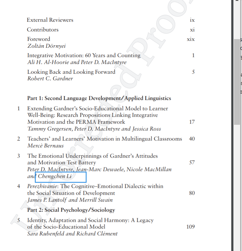 4. MacIntyre, P. D., Dewaele, J.-M., Macmillan, N., & Li, C. (2019). The emotional underpinnings of Gardner’s Attitudes and Motivation Test Battery. In P. D. MacIntyre& A. Al-Hoorie (Eds.), Contemporary language motivation theory: 60 years since Gardner and Lambert (1959) (pp. 57-79). Bristol: Multilingual Matters.
