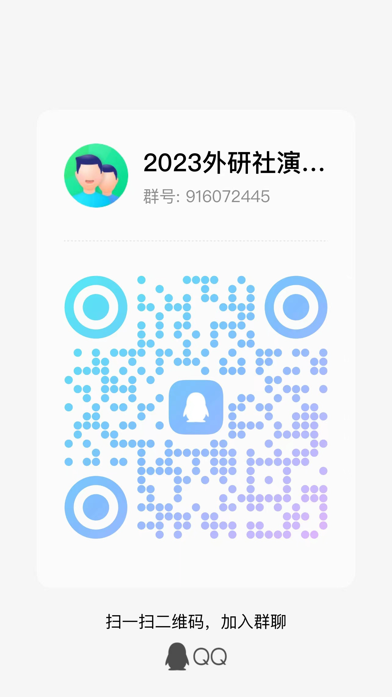 请报名演讲比赛的选手加入2023外研社演讲比赛QQ群,QQ群号:916072445。或扫描下方的二维码加群: