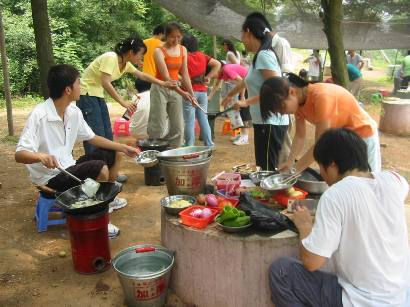 到达绿野山庄之后,大家狂K歌一阵后就到附近的小池塘里捕起了鱼。男生开始大秀刀法,女生洗菜择菜,之后大家在一起兴致勃勃地比拼起了厨艺。男生的厨艺不容小看:来自东北的邵凌超同学做起拿手的地三鲜来,当真是色香味俱全;来自安徽的凌烈鹏同学烹煮的鱼也相当不错;不过最为大家津津乐道的一道菜当属大一德语班付直波同学烹制的番茄炒蛋。当然,女生也毫不落后,男生刚退出舞台,女生便开始大展身手。接下来,大家欢欣地品尝,戏谑地品评,兴奋异常。其实大家做的菜应该说是很不专业的,但是吃着自己做出来的菜,就有一种说不出的成就感,每一个人都沉浸在劳动与合作的愉悦之中。