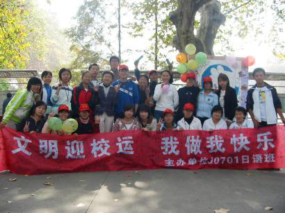 【伟德国际1946bv官网团学联新闻部讯】通讯员 徐良华、孙敬白 报道:11月8日至11月9日运动会期间,伟德国际1946bv官网日语0701班在运动会场外主干道紫荆路上举行了以“文明迎校运,我做我快乐”为主题的特色团日。