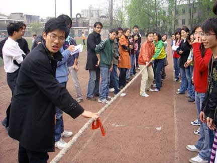 拔河比赛作为传统项目在这次的活动中给人另一种震撼:女生无敌!组织部的“联合国组委会”因男生有限,上场的绝大多数是女生,却出乎意料的一路连胜,摘取了拔河的桂冠,巾帼不让须眉的勇气与魄力让人感动。同时,各队对决中接连出现的势均力敌的场面让现场的每一颗心都随着那红绳紧张跳动,力挽狂澜的一瞬又让人欢呼雀跃!