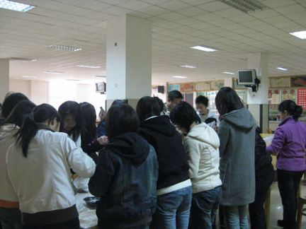 归功于班长樊建忠同学2个多小时的精心准备,同学们才得以见到大袋大袋的饺子馅,大包大包的饺子皮。以上这些材料给了同学们快乐的40多分钟。“饺子好吃,实在难做。”先不要说众口难调,单是在华科这样一所全国性高校里,来自五湖四海的同学们对饺子的概念就已经是五花八门。包法各具特色,样子也千奇百怪。有的捏成了烧卖,有的包成了馄饨,更有甚者将其弄成了“娃娃头”。想象力之丰富,实在让人叹服。虽然做出来的效果从审美角度看似乎有些“不堪入目”,但过程无疑是快乐的,现场气氛也是极其高涨的,还不时会有人推销自己的“招牌”饺子。