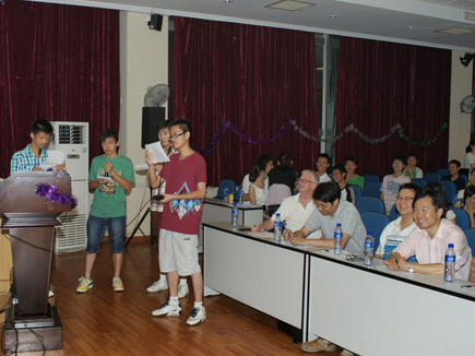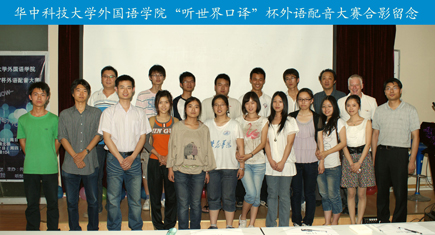 七点整,伴随着来自华科“口语沙龙”协会成员的一首动人的吉他弹唱To Be With You,配音大赛决赛正式开始。此次比赛进程分为风采展示、配音比赛、颁奖总结三部分。首先,进入决赛的六支队伍分别进行了简短的成员介绍。他们或唱歌,或朗诵,或表演,各展所长。在接下来的配音比赛中,六只风格各异的代表队为观众们奉上了一份语言文化的大餐。日语、英语、德语,各种不同的语言在同一个舞台上完美地呈现出来。各个队伍的配音节目不仅有经典电影、动漫,更有诸如Big Bang Theory这样的时尚热播的各国电视剧。在配音过程中,下面观众不时为选手们流利的口语所折服,抑或是被选手投入的情感演绎而打动。在表演《樱桃小丸子》日语配音时,来自日语1001班的四个男生为大家带来的反串生动风趣,赢得了全场热烈的掌声。而由来自伟德国际1946bv官网各个系的老师和外教组成的评委团,以及特邀嘉宾——来自听世界口译的姜涛老师——也用各种语言从各个角度对选手们的表现进行了点评。在“方言大挑战“观众互动环节中,大家都踊跃上台,一展自己家乡方言风采,也着实让大家开了眼界。