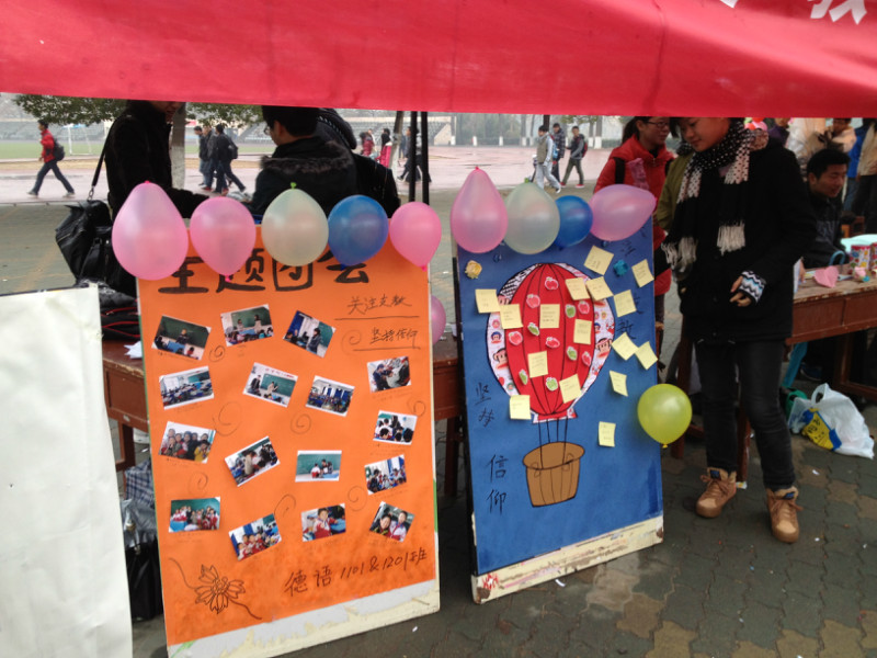 寒气逼人的清晨,在雾霭还朦胧时,德语班的同学就已经开始了各项准备工作。他们忙碌着,搭帐篷,拉横幅,吹气球,准备礼物,布置各个游戏场地……尽管天上还洒着小雨,他们还是乐在其中。