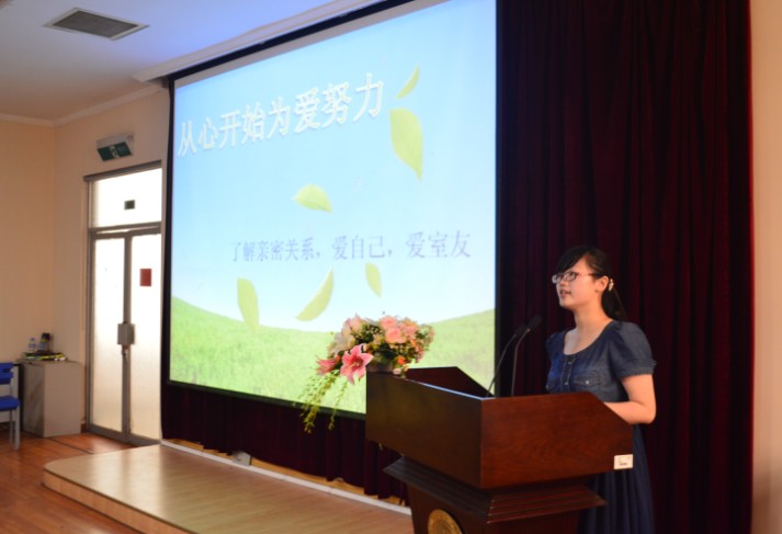 在同学们的热烈掌声中,安导首先致辞。她以“感恩”入题,用真诚关切的语调向同学们表示了要以感恩之心善待身边的人,与室友和谐相处的期望,并号召大家能够互相理解包容,共同进步。