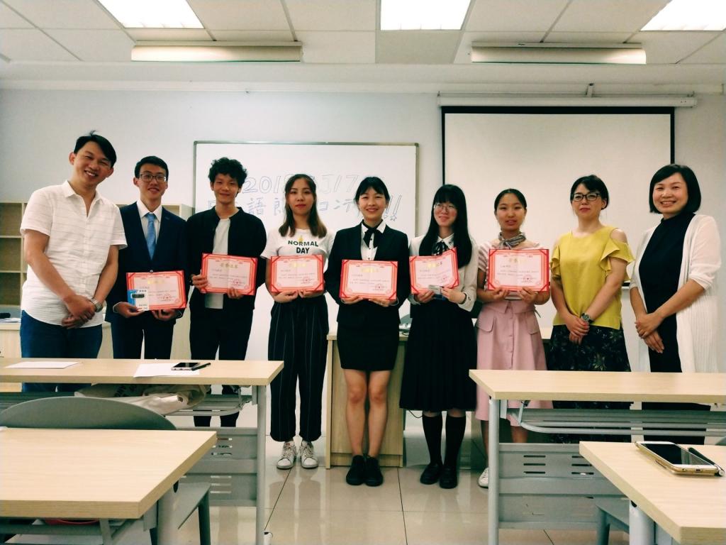 最终,王程程同学获得了一等奖,刘佳俊和罗雨蕊同学获得了二等奖,吕晔、王璐、李思雅获得了三等奖。王闰梅老师、高かおる老师、柯子刊老师分别为获奖同学颁奖。至此,2018年日语1701班第一次朗读大赛圆满结束。