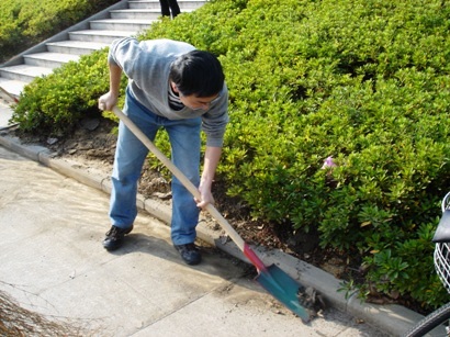 下午2:00,活动正式拉开序幕。一群拿着扫帚和铁锹的同学出现在逸夫教学楼前湖边的走廊上,周边的草坪上也多出了十几个忙碌的身影。
