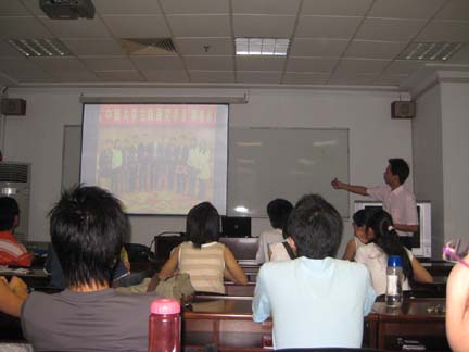 大会在主持人赵鑫的简单介绍中拉开序幕。首先上台的是熊好学。在和同学们交流了对老员工自立自强的看法之后,他讲述了个人在大学中的成长经历,同大家分享了中南财经政法大学自强社和“爱心超市”的发展经验,其间对自强社的义务支教活动进行了重点介绍。他表示,所谓“自强”即要做到三点——抓住学习机会,实现自我价值和把自强习惯化。他就中南财经政法大学自强社的宗旨——“传递社会关爱,锻造自强之才”,强调要把个人的自强同服务社会结合起来,实现个人和社会的双重价值,而不能仅仅注重个体的发展。熊好学的一席话给大家留下了深刻印象也引起了大家的深思。兰行行辅导员代表大家与他交流了关于自强社的完善以及个人发展等问题的看法,他认为主动出击、争取资源和保持团队的新鲜力量是发展团队的关键,而个人的发展则要依靠不断成熟的思想来推动。他的回答博得了大家由衷的掌声。