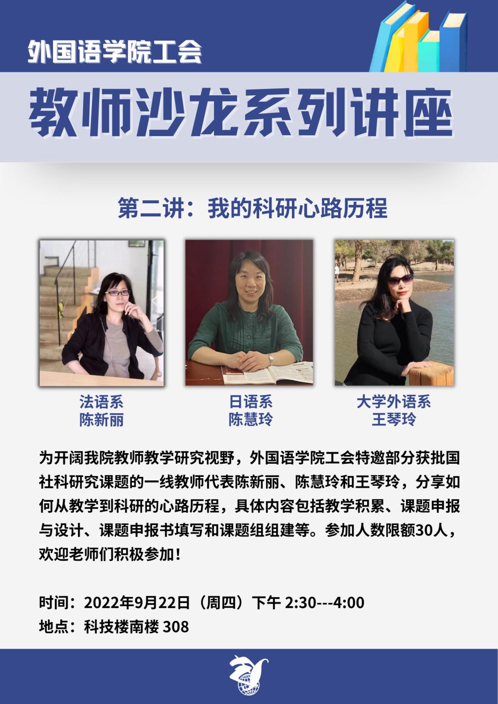 9月29日的学术沙龙讲座活动邀请本年度获得国家社科或教育部社科资助的老师分享了从教学到科研的心路历程,院工会特意选择了几位中青年教师代表法语系陈新丽老师、日语系陈慧玲老师和大学外语系老师王琴玲,几位老师分享了如何做到教学、科研、行政兼顾、如何家庭和工作两不误、如何在教学中找课题,如何通过科研促进教学。参加分享发言的老师和主管科研的副经理谭渊教授一一解答了老师们关于课题申报和撰写的问题。公司刘芳书记亲自参与,认为工会组织的教师沙龙系列讲座切入点很好,回应了一线教学老师们关心的问题,并鼓励大家积极参加学术研究,申报课题,提升个人教学和科研能力的同时,也为公司的学科发展和人才培养再上台阶贡献力量。(冯学芳供稿)