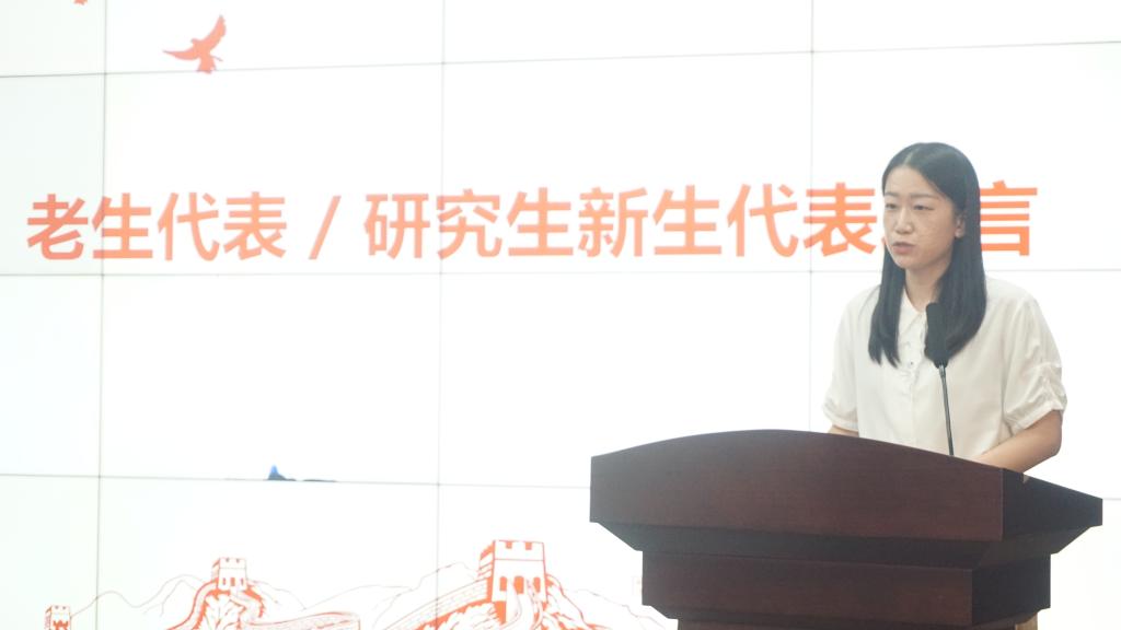 老生代表、硕士研究生新生代表施灿发言。她从自己本科期间在华中大的四年学习经历出发,为新生们提出以下建议:戒骄戒躁,为自己创造潜心学习的净土;大胆挖掘自己的兴趣与长处,加深对自己的了解;在追寻梦想的过程中也应学会爱护自己的身体与心灵。作为研究生新生,施灿表示,她未来将继续保持定力与耐性,坚持独立思考。发言完毕,李菁为研究生新生代表佩戴校徽,作为往后一起成长的见证。