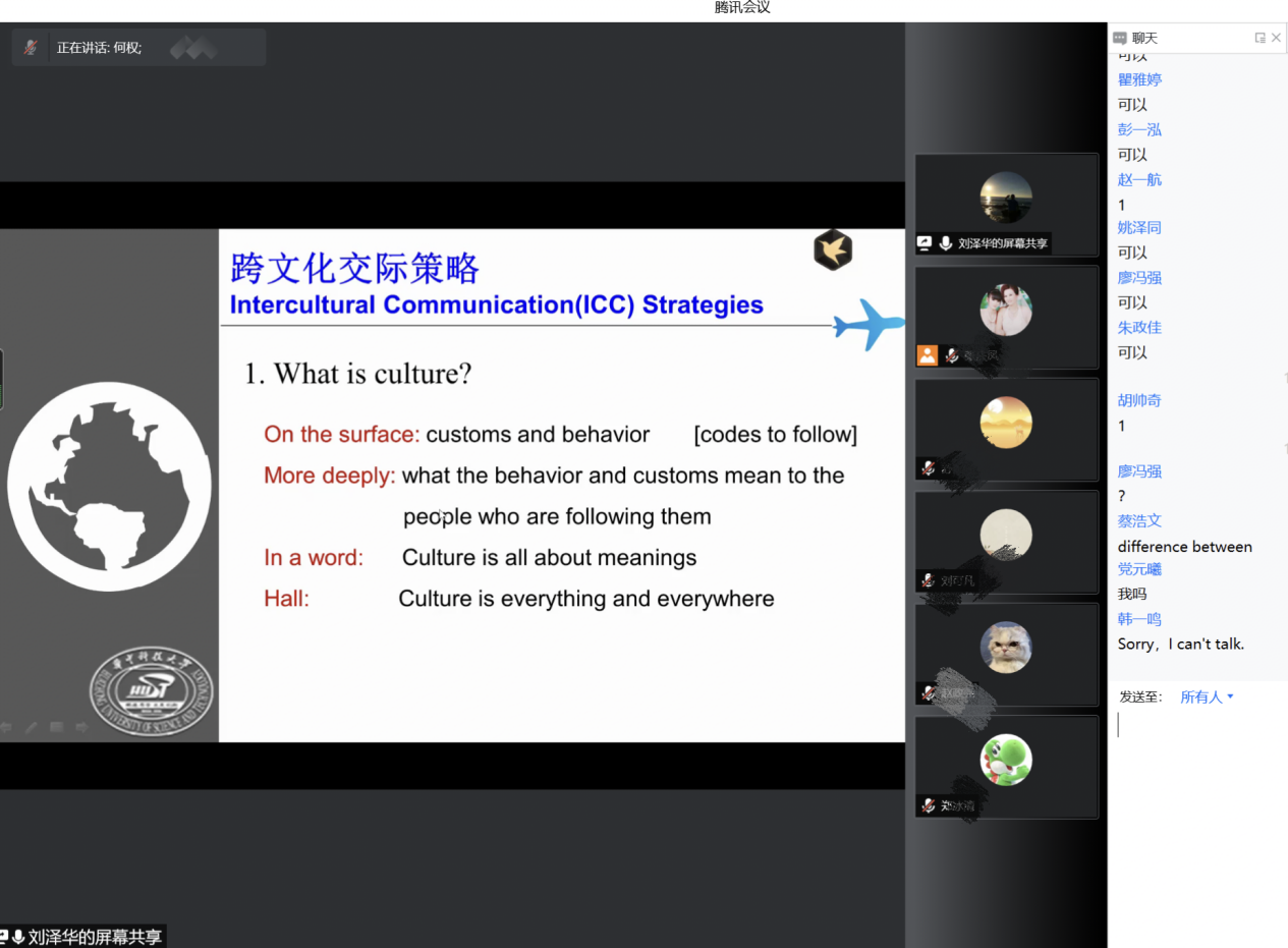 刘泽华教授学贯中西的渊博学识,深入浅出的授课风格,信手拈来的轶闻趣事,让屏幕另一端的同学们充分领略到华中名师的风采,让跨文化交际理论变得生动平实。