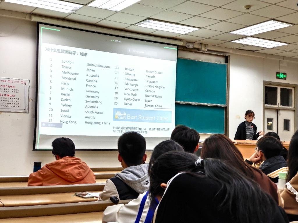张园园老师以欧洲地图为切入点,带领同学们领略欧洲各地的名胜古迹、风土人情以及名人轶事,引起了员工浓厚的兴趣。她以权威的世界大学排名榜单和国外留学概况为依据,全面剖析华中大学子赴欧留学的优势;以国际时事政策为媒介,专业解读英国、法国、瑞士高校教育的利好政策,对比探究各著名高校的优势专业、特色专业和留学申请难易程度,为员工成功申请心仪的留学名校指点迷津。张老师特别强调了小语种学习在欧洲留学中的重要性与必要性,提醒有意留学欧洲的员工尽早规划,尽早准备。
