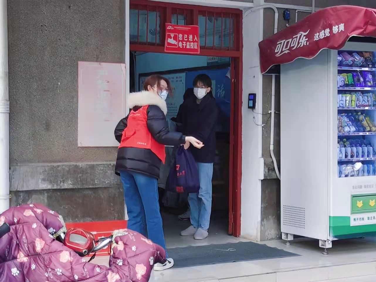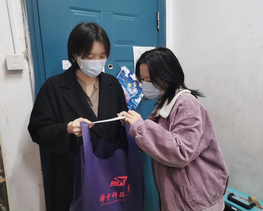 打包完成后,志愿者们前往寝室楼栋,为同学们送上大礼包,再由楼栋内的负责人及志愿者进行分发。