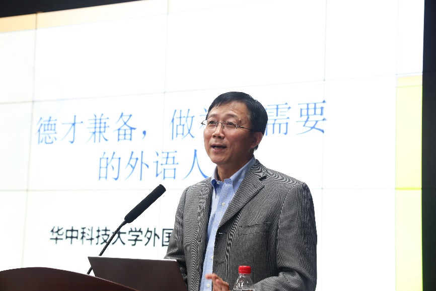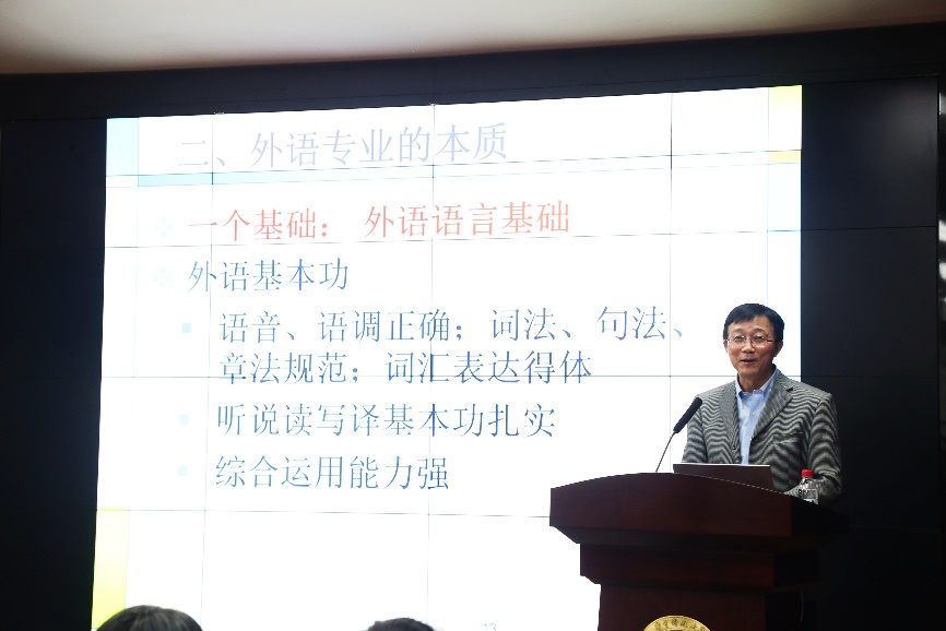 对于外语专业的本质,许明武表示,外语不仅是一项工具,更是学习其他自然、社会学科的重要铺路石,对人生方向选择有重要的引导作用。外语学习的最终目标,则是要将外院学子培养成能适应国家经济建设和社会发展需要的专业型人才。因此,同学们需在具有良好道德品质和正确的世界观、人生观的同时,还需拥有家国情怀、社会责任感和团结合作精神。公司采用“外语+专业”、双学位等复合型人才培养模式:在夯实语言基础的同时,提升思想道德和文化素养;在提升独立思考能力的同时,增强分析问题和运用知识的能力;在加强创新思维的同时,培育健全的人格。