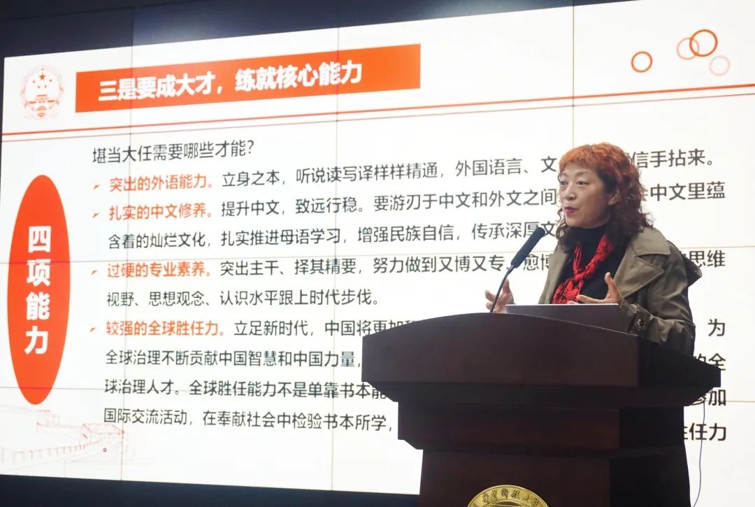 首先,刘芳通过阐述“国之大者”这一概念,开门见山,点出主题:新时代背景下,外语学子要立大志,明大德,成大才,担大任,争做外语人才,用所学本领实现强国梦想。