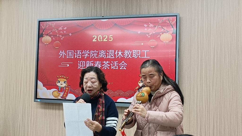 娱乐活动环节精彩纷呈,现场气氛热闹非凡。张道宝老师以一曲激昂的《骏马奔驰保边疆》开场,点燃了现场的气氛;猜谜语活动将欢乐推向高潮,老同志们思维碰撞、妙趣横生,笑声与掌声交织不断;徐建初老师的楚剧《鱼腹山》表演引人入胜,赢得了满堂喝彩;在朱连芳老师的葫芦丝伴奏下,陈蔚老师演唱了歌曲《有一个美丽的地方》,葫芦丝美妙的音色和陈老师动人的歌声相得益彰,令人回味无穷。