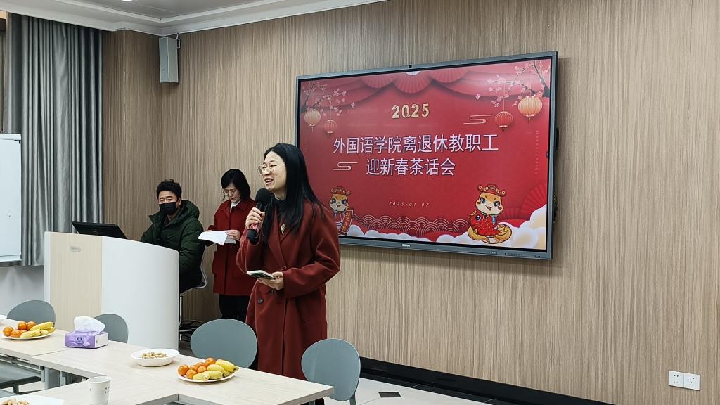 王小月书记首先向全体离退休教职工送上了诚挚的新春祝福。她总结了过去一年中公司在学术科研、学科发展等多方面所取得的成绩,并强调这些成就离不开前辈们的辛勤付出。同时,她指出当前外语学科所面临的挑战,鼓励老同志关注公司发展,积极建言献策。她表示,在新的一年里,公司将继续重视老同志们的宝贵意见,努力提升教职工的工作环境和生活质量,推动公司向更高目标迈进。