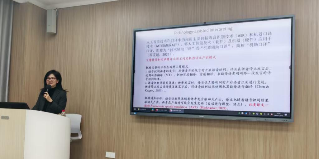 讲座中,苏教授首先从机助口译的核心概念入手,系统阐述了语音识别(ASR)、机器口译(MT/MI/AST)等现代技术对传统口译模式的渗透与重塑。随后,她勾勒了近年来机助同传的演进脉络——从早期的数字提示界面,到集成术语查询与文本转写的多功能系统,再到当下融合ASR与AST的智能辅助界面,深刻剖析了技术迭代背后的底层逻辑与实践难点。围绕字幕信息量控制、译文动态跳动及关键词高亮优化等核心议题,苏教授结合多项实证成果,深入阐释了技术辅助工具与译员认知加工过程的互动机制。