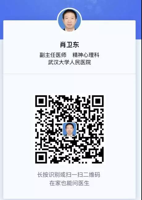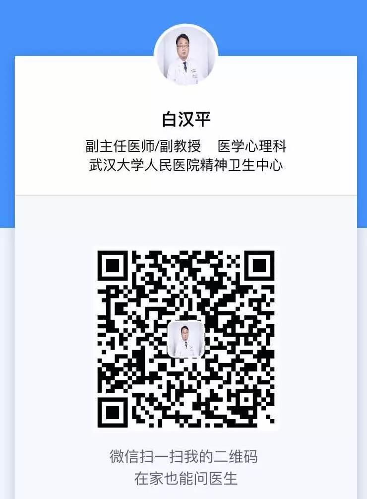 亲爱的同学:当前,疫情防控工作正处于关键时期,各大高校都延迟开学。正处于心理疾病治疗阶段的同学尤其要关注自我的心理状态,坚持治疗。考虑到目前就诊与开药的实际困难,武汉大学人民医院精神卫生中心白汉平主任与肖卫东主任申请了互联网医院平台处方权,有需要的同学可免费在平台上问诊、开药。此平台是非常正规的上市公司旗下的互联网医院平台,药物全、价格合理,负责邮寄。以下是平台的二维码入口。有问诊、开药相关需...