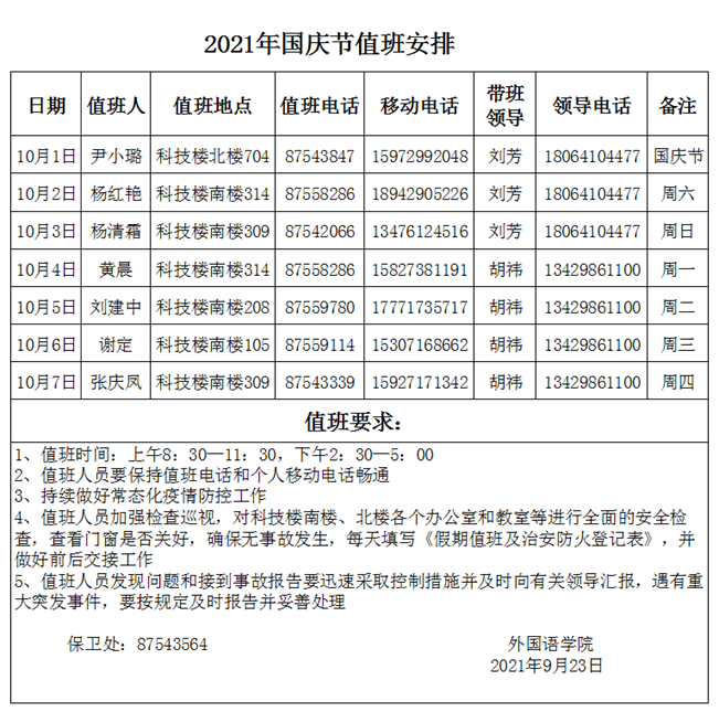 各单位要妥善做好国庆期间应急值守工作,严格执行值班制度和领导带班制度,值班领导须保持24小时通讯畅通,遇有突发事件要立即启动应急预案,及时响应、稳妥处置。突发和重要紧急情况及时处置并报公司总值班室(值班电话:87542011),杜绝迟报、谎报、漏报和瞒报。